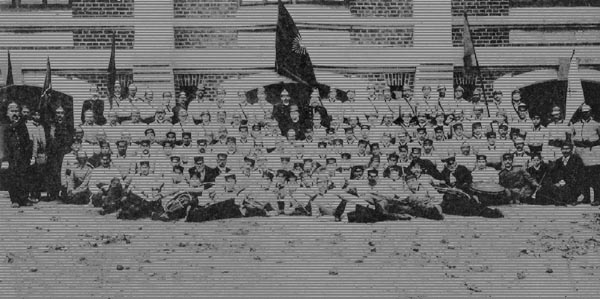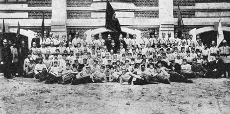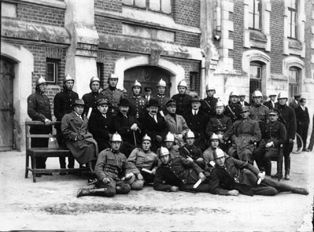 w środku siedzą: naczelnik Stefan Uściński, adiutant Jan Radwański, kapelmistrz Stanisław Bartoszewicz