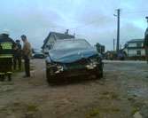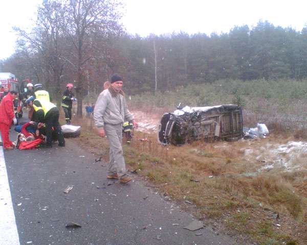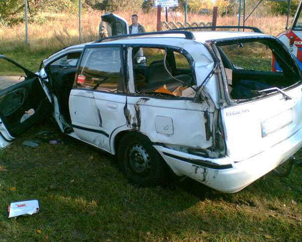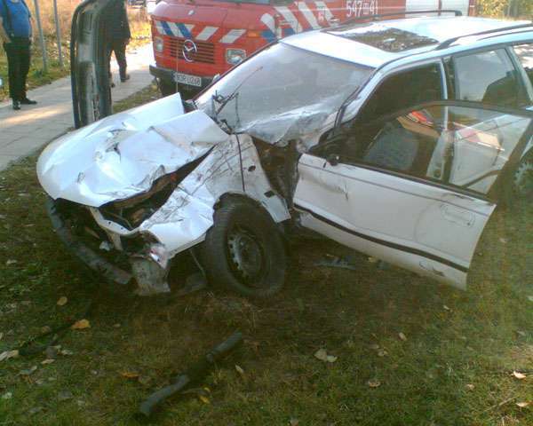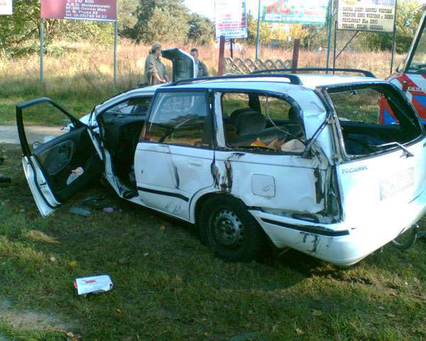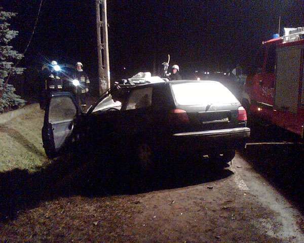 Prawdopodobnie nadmierna prędkość, była przyczyną tragicznego wypadku do którego doszło o godzinie 19.48 na ul. 3-go maja. Po przybyciu na miejsce wypadku samochód osobowy marki Honda znajdował się na poboczu drogi a na nim leżał ścięty na skutek uderzenia słup energetyczny. W pojeździe uwięziona była pasażerka, którą przy pomocy narzędzi hydraulicznych wydobyto z wraku pojazdu. Kierowca samochodu leżał na ziemi obok samochodu. Wezwane na miejsce Pogotowie Energetyczne zabezpieczyło złamany słup oraz zerwaną linię. Następnie przy użyciu piły do betonu pocięto słup i usunięto z pojazdu oraz jezdni. Ranne osoby w stanie ciężkim zostały zabrane do szpitala.