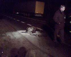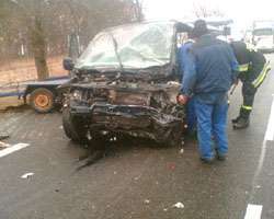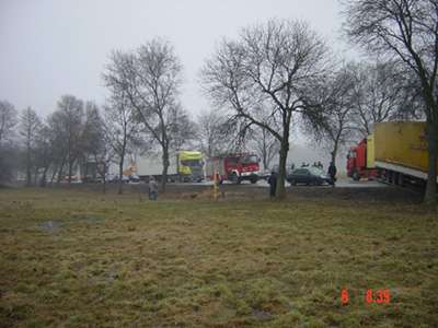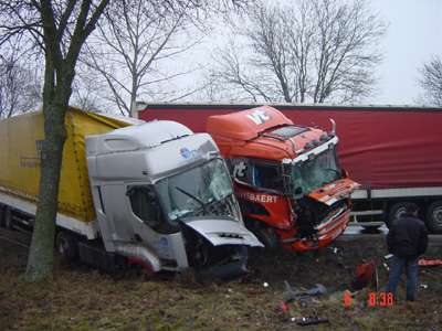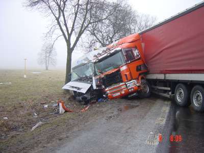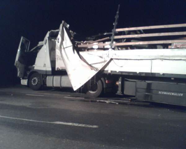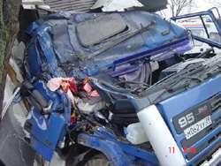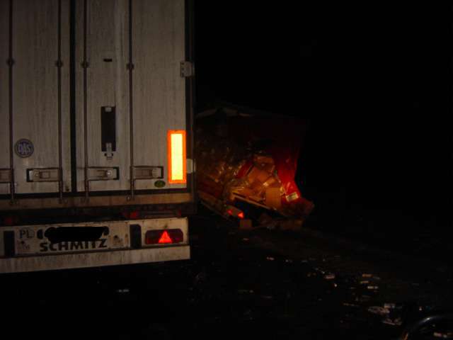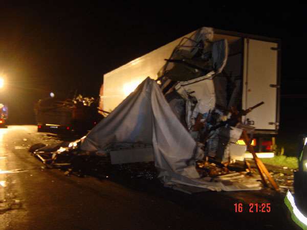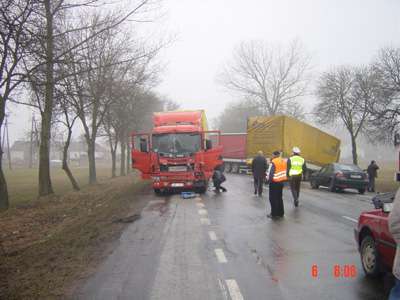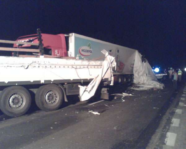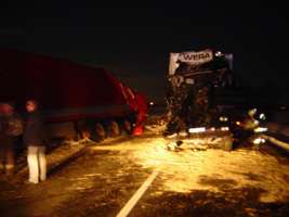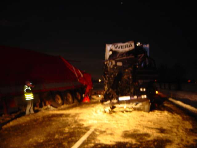 W dniu 1 lutego br. o godz. 21 04straż pożarna otrzymała wezwanie do wypadku dwóch samochodów ciężarowych w Gniazdowie, na trasie Ostrów Maz.- Łomża. Po dojeździe na miejsce zdarzenia jednostek straży samochód ciężarowy DAF wraz z naczepą znajdował się w przydrożnym rowie. Natomiast samochód ciężarowy Scania wraz z naczepą znajdował się na drodze, całkowicie ją tarasując. W jednym z pojazdów znajdował się zakleszczony kierowca, którego wycięto z wraku kabiny przy pomocy narzędzi hydraulicznych. W działanich ratowniczych brały udział 3 zastępy JRG PSP, oraz 1 zastęp OSP Lubotyń. Okoliczności wypadku bada KP Policji w Ostrowi Maz.