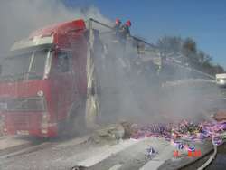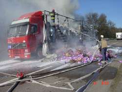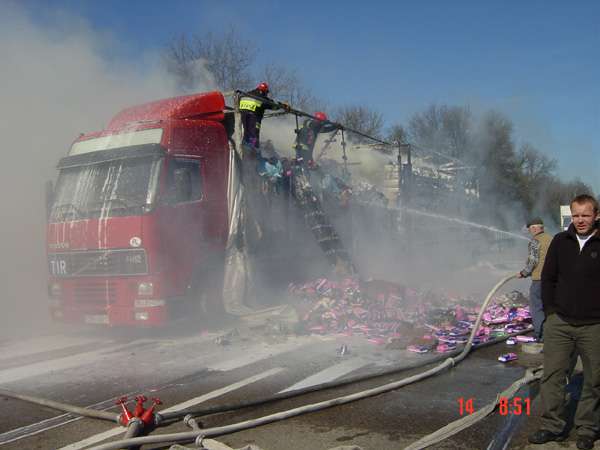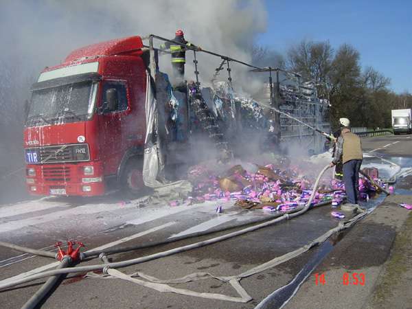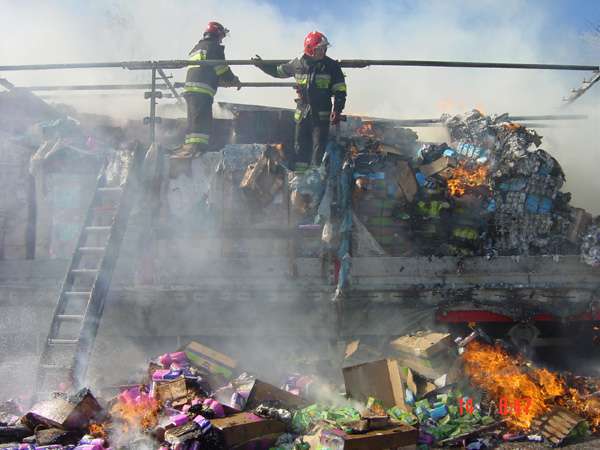 patyczki higieniczne itp. Działania straży pożarnej polegały na podawaniu 2 prądów piany ciężkiej w natarciu oraz prądów wody w obronie kabiny ciągnika siodłowego. Ładunek