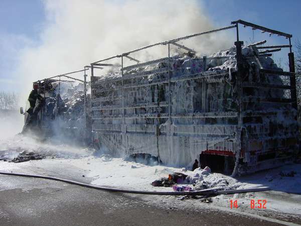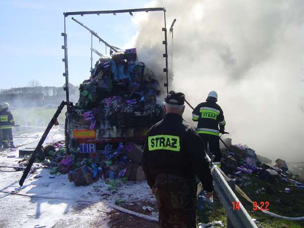 zrzucono z naczepy i przyczepy, przelano wodą i uprzątnięto z jezdni do rowu.Do pożaru doszło prawdopodobnie na skutek zwarcia instalacji na przyczepie. W akcji gaśniczej brały udział 3 zastępy JRG PSP, oraz JW Komorowo oraz OSP Komorowo i Sielc.