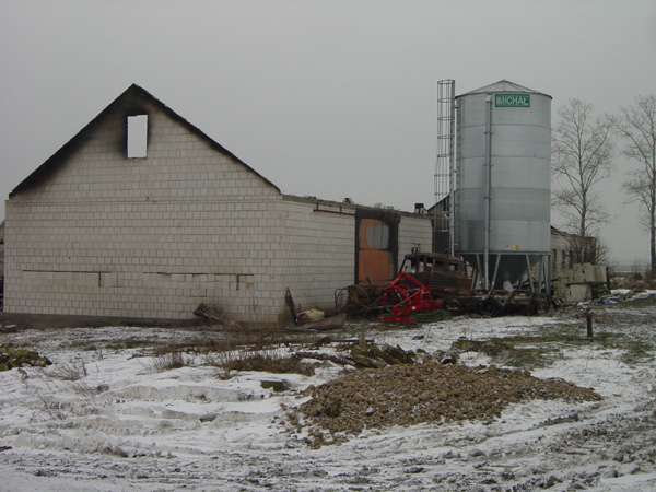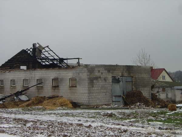 i siano. Działania straży pożarnej w pierwszej kolejności polegały na obronie zagrożonej obory. Po dojeździe kolejnych zastępów ratowniczych wprowadzano prądy gaśnicze w natarciu. Działania w których uczestniczyło 10 zastępów straży, zakończono po prawie 6 godzinach. Przyczyna pożaru było prawdopodobnie zwarcie instalacji elektrycznej.