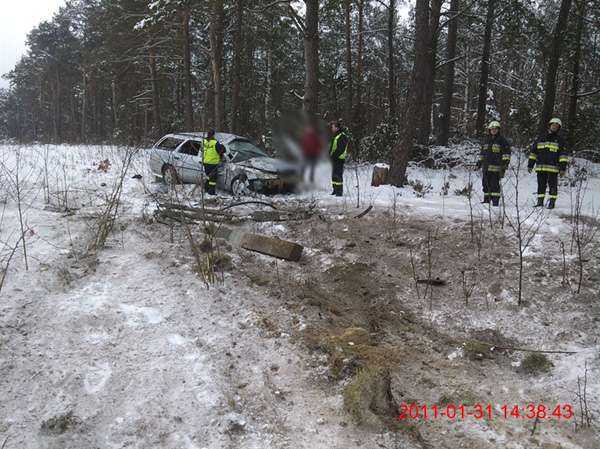 W dniu 2 marca br. o godz. 16.41 doszło do wypadku drogowego miejscowości Gąsiorowo, gm. Zaręby Kość. Prawdopodobnie w wyniku nadmiernej prędkości kierujący samochodem VW Vento, stracił kontrolę nad pojazdem i uderzył w drzewo. Ranne ostały dwie osoby jadące pojazdem. Straż pożarna uwolniła kierowcę zablokowanego w pojeździe za pomocą narzędzi hydraulicznych. W działaniach uczestniczył zastęp OSP Zaręby Kość. oraz zastęp JRG PSP Ostrów Maz.