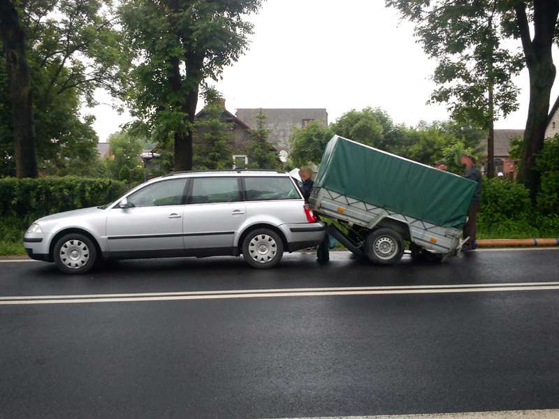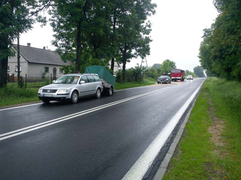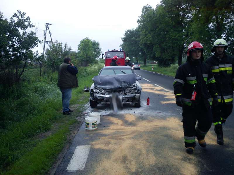 Kierowca podróżujący samochodem osobowym marki Opel Vectra uderzył w tył VW Passata ciągnącego przyczepkę, w wyniku czego zapalił się. Pożar ugaszono przy pomocy gaśnic przed przybyciem straży pożarnej. W wyniku wypadku nikt nie odniósł obrażeń. W działaniach ratowniczo-gaśniczych brał udział jeden zastęp JRG PSP.