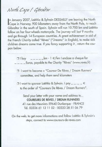 W dniu 18 marca nasza jednostka miała okazję gościć niecodziennych ludzi, Państwo Laetitia i Sylvain DESSAILLY w styczniu 2007 roku wyruszyli z North Cape w Norwegii, 900 kilometrów od bieguna północnego z zamiarem dotarcia do Giblartaru na południu Hiszpanii. Sylvain przebiegnie w tym czasie 10.700 kilometrów a Laetitia podąża za nim czterokołowym motocyklem. Podróż będzie trwała ok. 9 miesięcy a jej trasa przebiega przez 14 europejskich krajów. Tak się złożyło że Sylvain jest zawodowym strażakiem z Francji, a na stałe mieszka i pracuje w Dunkierce. Powodem dla którego podjął ten niespotykany wysiłek jest chęć pomocy dzieciom poprzez francuską fundację "Reves" tj. MARZENIA. Na całej dotychczas przebytej trasie straż pożarna różnych krajów udzielała mu pomocy, m.in. tak jak my poprzez zapewnienie noclegu. Wszystkich chętnych do zapoznania się z jego niecodzienną misją zapraszamy na stronę www.coureurs-de-reves.com